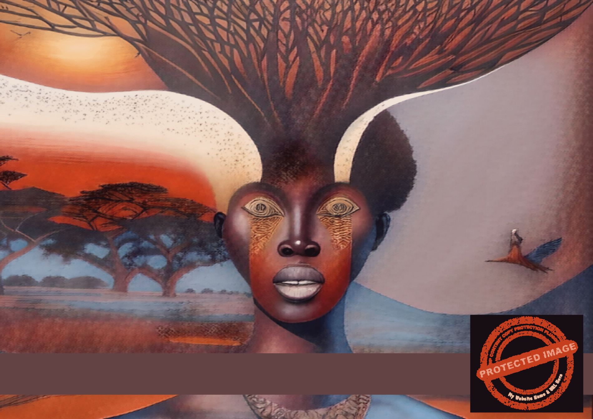 Experience the power of transformation and connection with this mesmerizing digital art print from Nijalo Art, featuring a surreal African portrait where elegant tree branches emerge from the figure’s head and golden tears flow down the face. The dramatic landscape of distant acacias, warm earth tones, and a solitary bird evoke a sense of wonder and introspection. This artwork is a poetic tribute to resilience, heritage, and the unity between people and the land—perfect for those who appreciate art that tells a story.