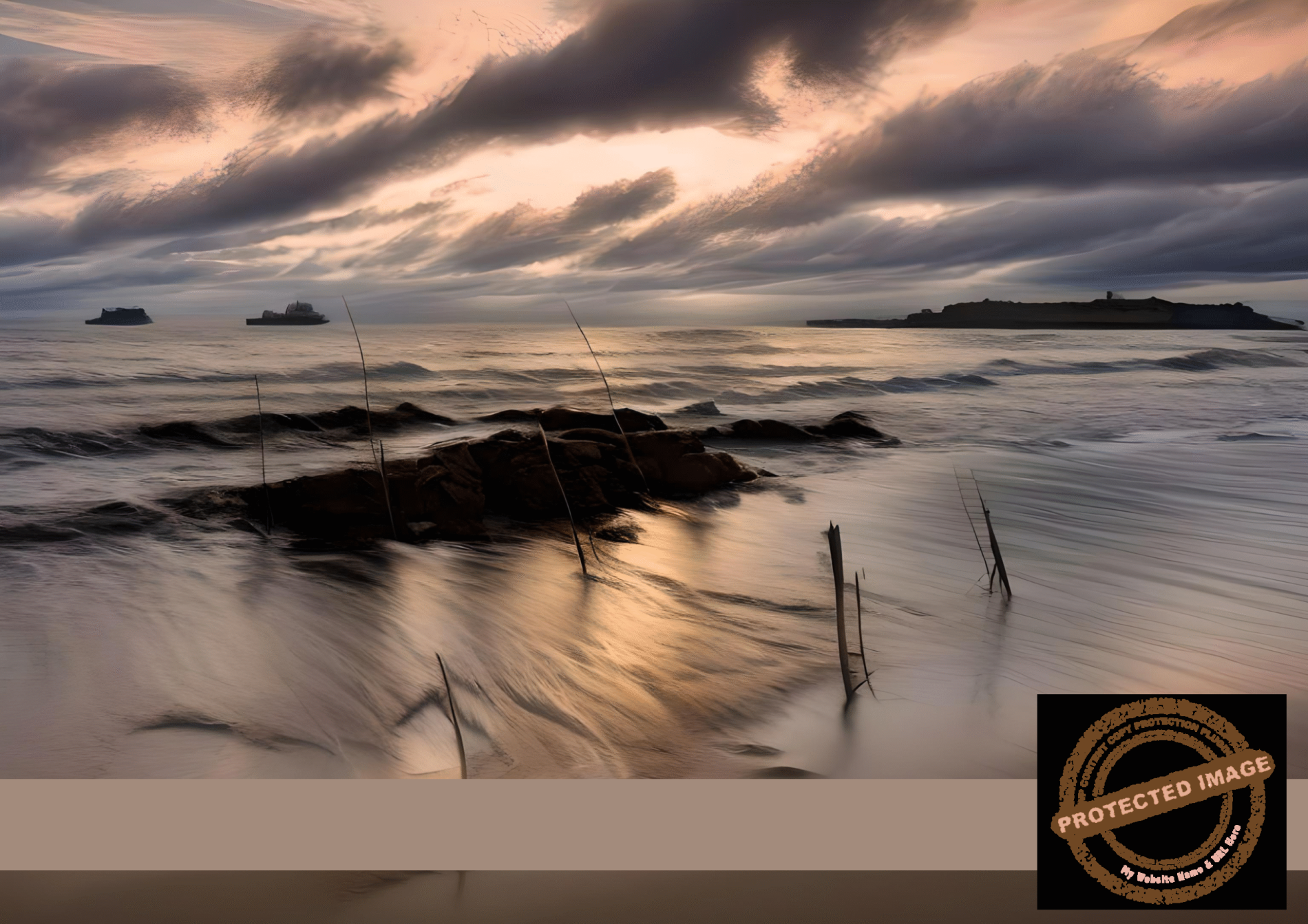 - Foreground rocks, reeds, and tranquil sand patterns