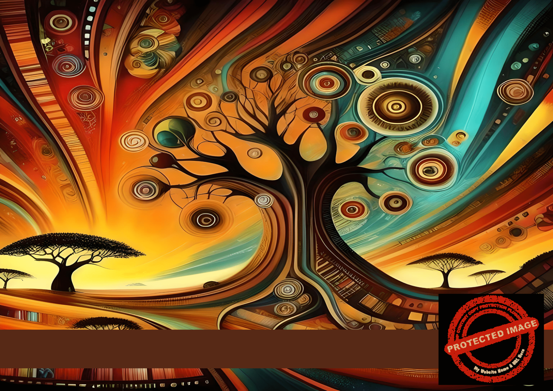 - Radiant abstract African landscape with orange, gold, and teal swirls and spiral motifs