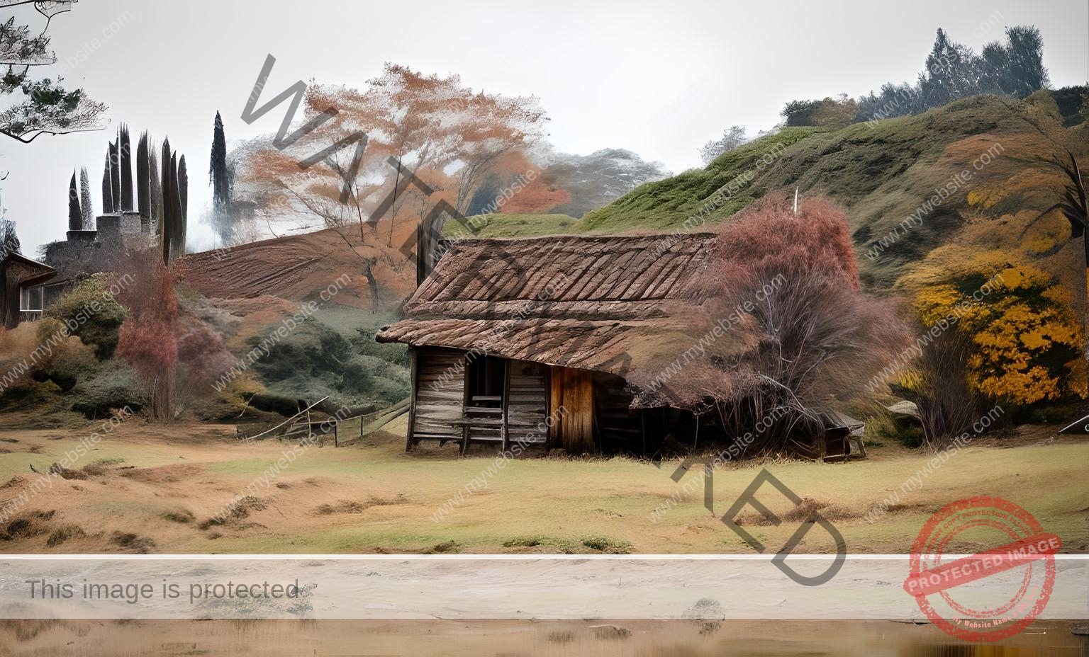 A weathered cabin with a rust-red roof sits amid a windswept autumn field. Weathered wooden walls bear the patina of time, while a broken fence and tufts of amber grasses punctuate the foreground. Behind, a gentle slope rises to rolling hills, their earth tones warmed by late-day sunlight and a touch of copper-bronze in the foliage. Sparse trees frame the scene, their bare branches adding a skeletal grace against a sky of soft clouds and pale blue. Rendered in a painterly digital style, the image blends warm ochres and russets with cool shadows and misty distance, creating a mood of quiet reflection, memory, and resilience in the face of changing seasons. The composition invites contemplation of home, abandonment, and nature’s steady reclamation of the land.