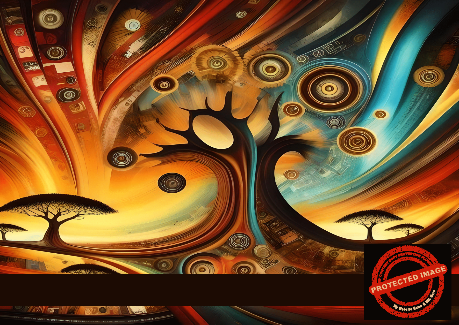 - Abstract African landscape with swirling orange, gold, teal, and spiral motifs