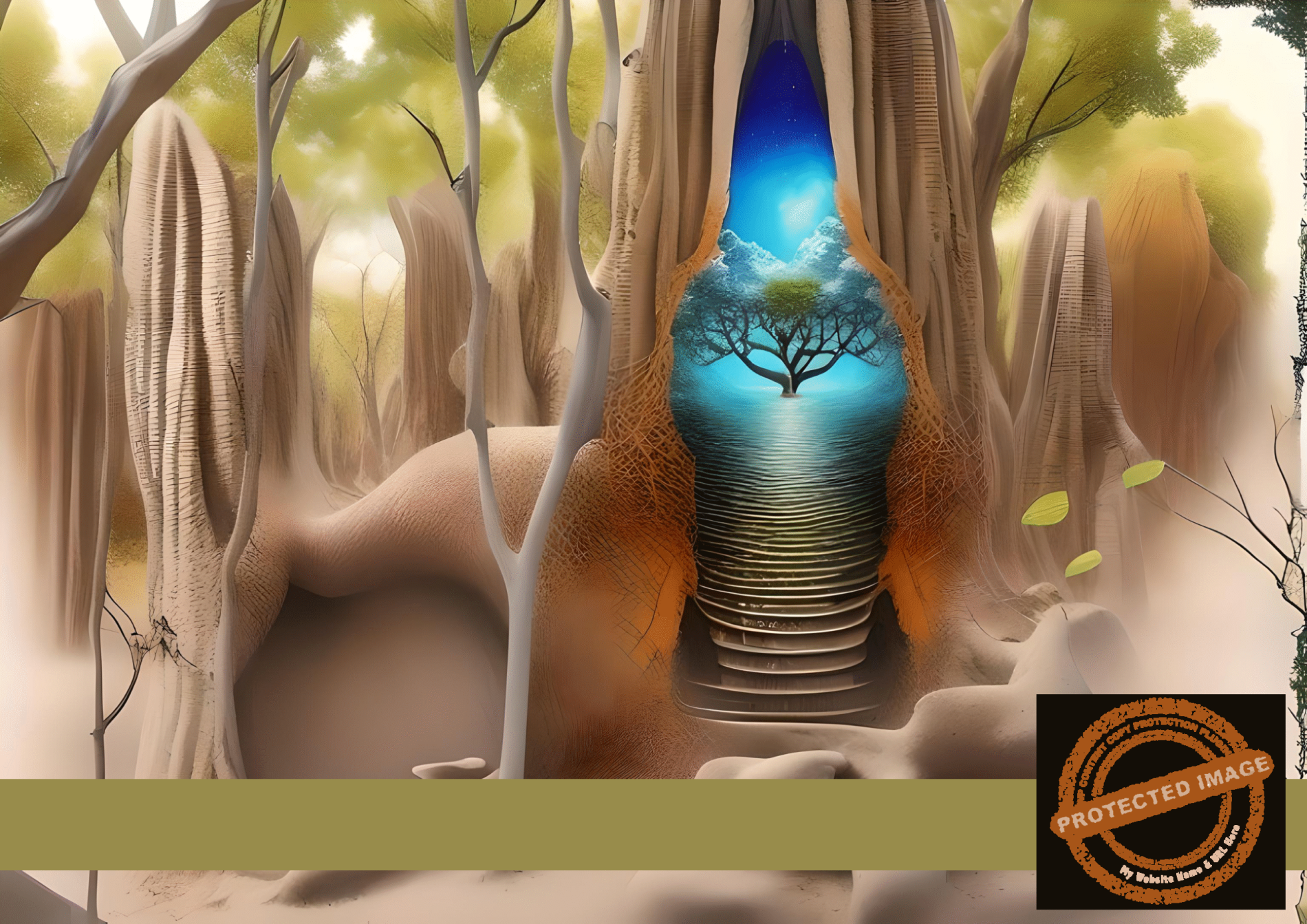 - Surreal tree landscape with ancient trunks and a glowing blue portal