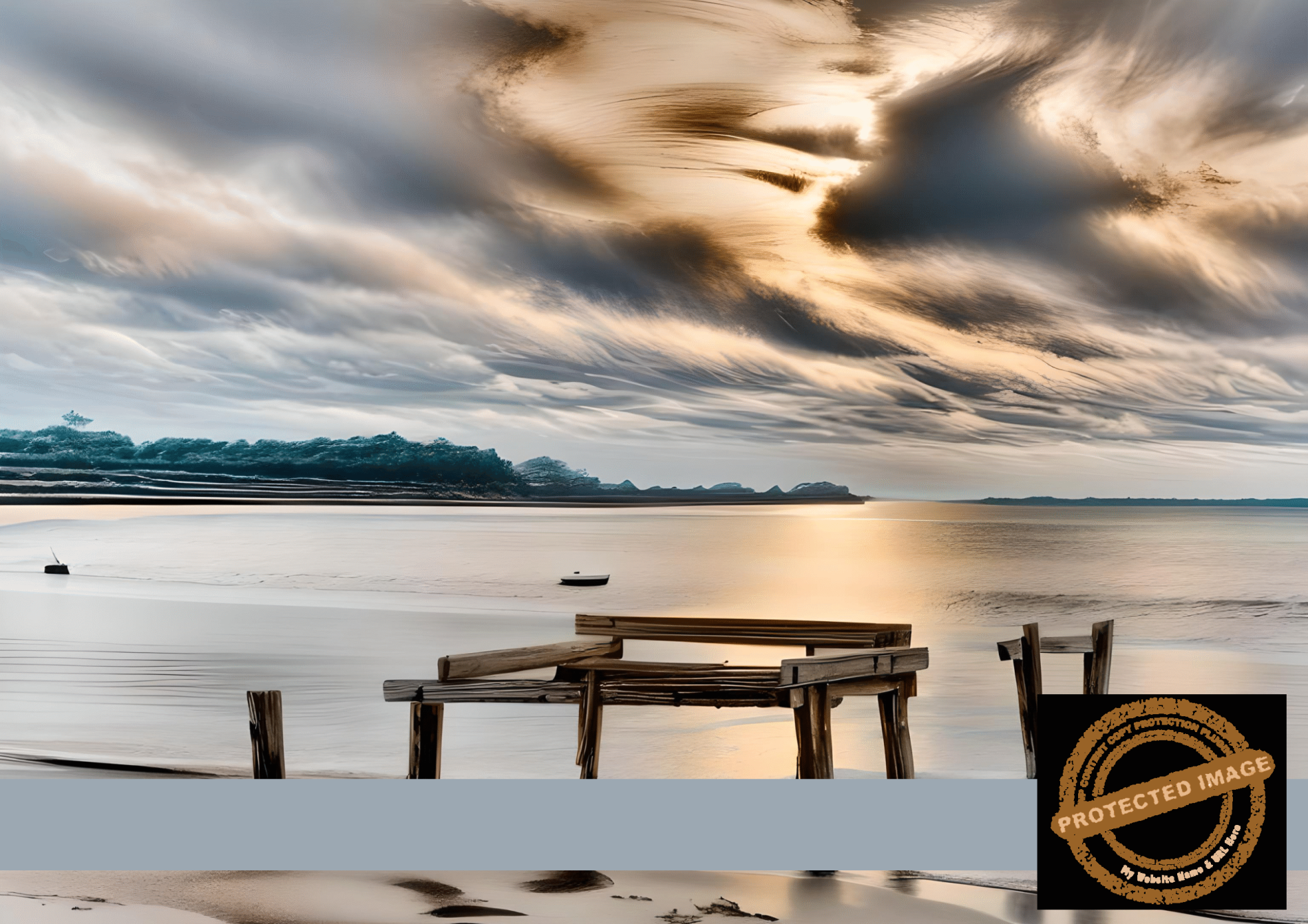 Celebrate the timeless beauty of Western Australia’s coast with this striking digital art print from Nijalo Art, featuring the iconic remains of the old jetty at Hamelin Bay. Weathered timber posts rise from calm, reflective waters beneath a sky alive with swirling sunset clouds and golden light. The tranquil beach and distant horizon evoke nostalgia, peace, and the enduring spirit of the sea—perfect for modern homes, beach cottages, or anyone who finds inspiration in coastal heritage and dramatic skies.